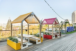 アートスポットODAIBAを中心に、シェアテーブルや植栽が広がります。