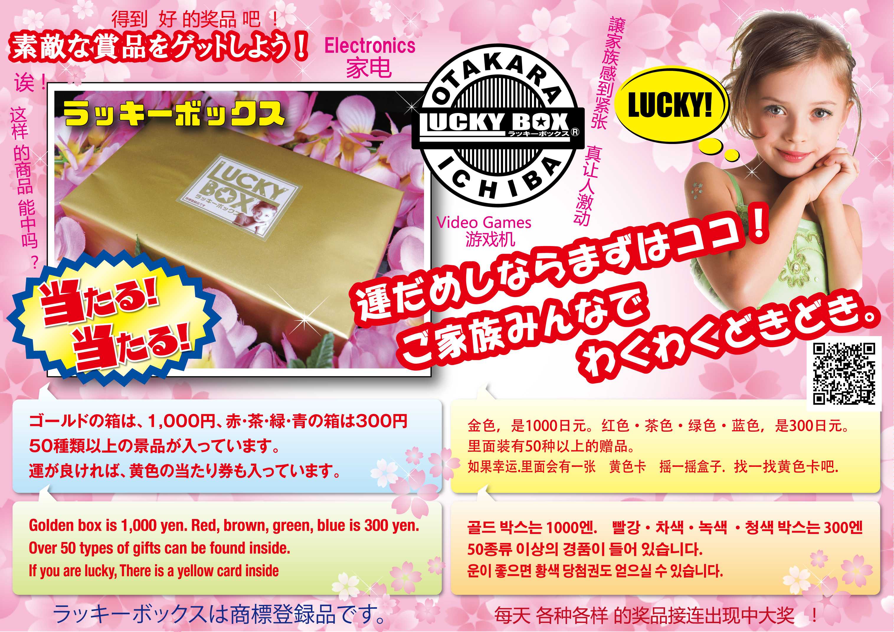 ご家族みんなで、わくわく、どきどき!お台場名物!運だめし! 300円、1000円の2種類のラッキーボックスの中にはそれぞれ50種類以上の素敵な景品が入っています。 さらに景品と一緒に当たり券が入っていた方には素敵な商品をプレゼント!!