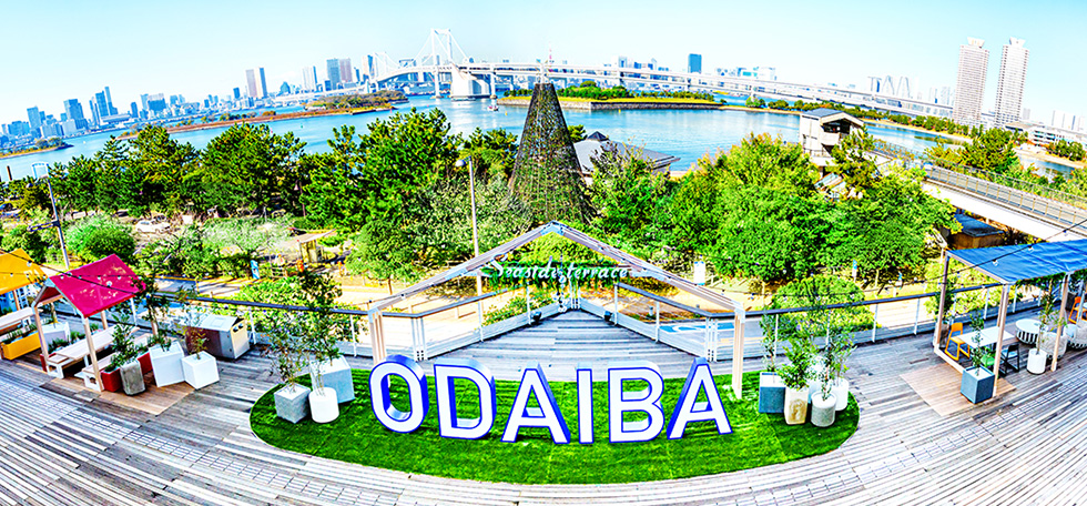 アートスポットODAIBAを中心に、シェアテーブルや植栽が広がります。