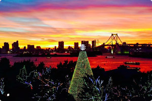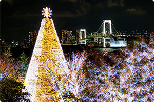 高さ約20mの「台場メモリアルツリー」は生木を使用したツリーです。レインボーブリッジや東京タワーをバックにした幻想的なイルミネーションは、東京湾の夜景を一望に見渡せる都内有数のスポットとしても人気です。