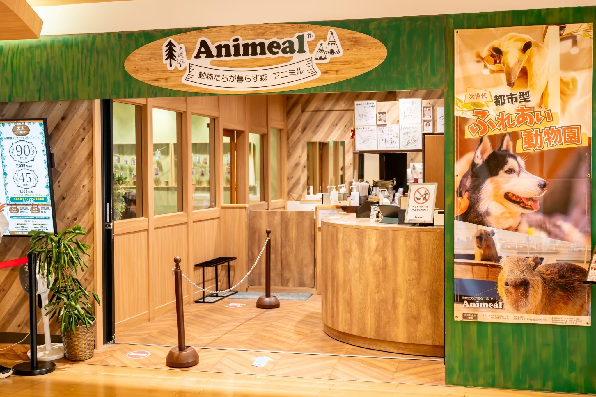 当店では普段出会えないような珍しい動物たちも、キャストとしてお客様をお出迎えいたします。動物のそれぞれの生態に合わせて、店内では照明演出や、日本初の試みである動物の昼夜交代制を取り入れ、森の表情の移り変わりを表現しています。本来の生活リズムで過ごすことで、動物達は活き活きとした姿を見せてくれます。