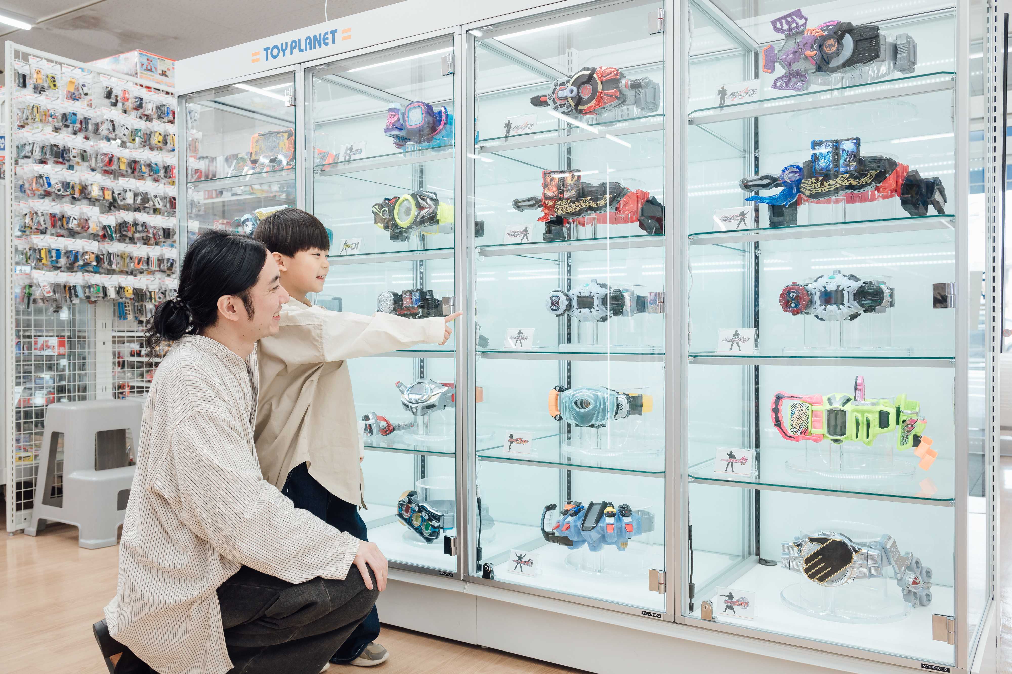 仮面ライダー、ウルトラマン、スーパー戦隊などのレアアイテムが並び、特撮ファンにはたまらない空間です。